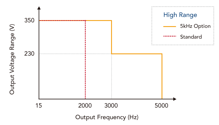 Chroma 61509/61508/61507机种可藉由选购配件提供5kHz高频率输出功能。而搭载此选购配件后,交流源机台会有不同的High / Low档位输出电压范围,其细节如下图所示。