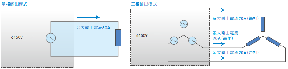 Chroma 61507/61508/61509提供选择单相或三相输出功能,使用者可以经由前面板或远端控制选择单相或三相输出模式。即使设置在单相输出模式,仍然可以提供功率输出的能力,不需担心输出功率规格会有递减的情形。