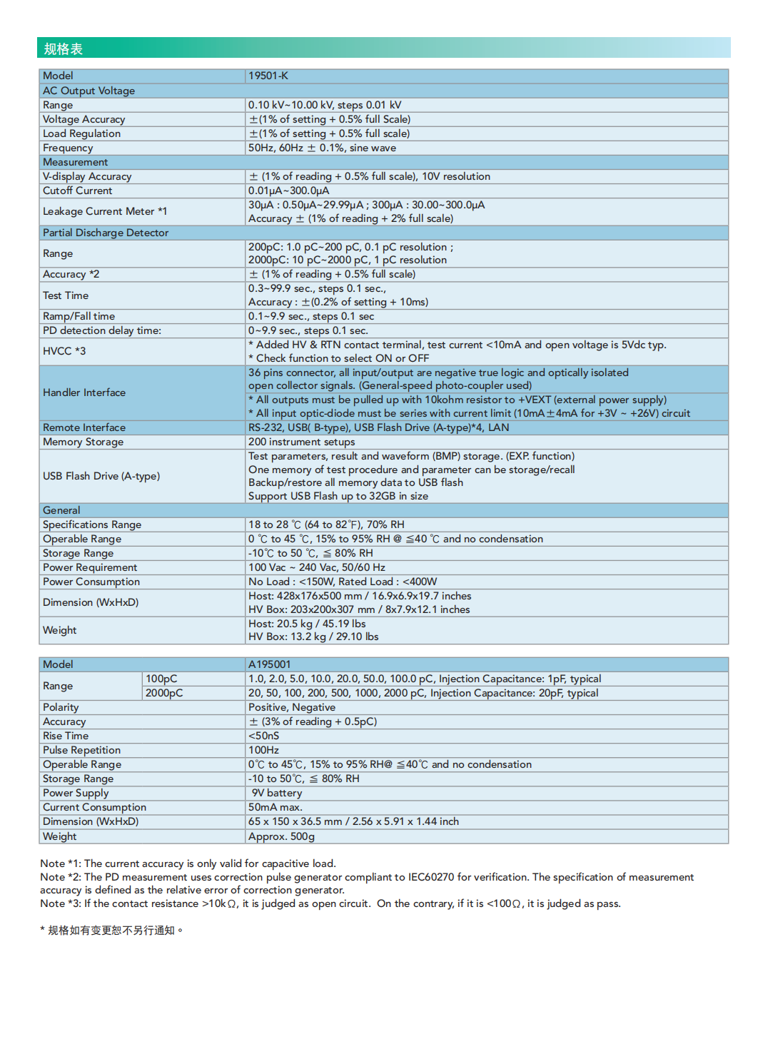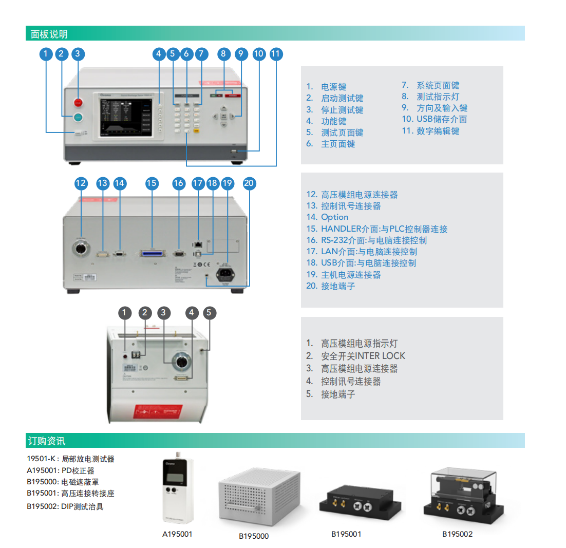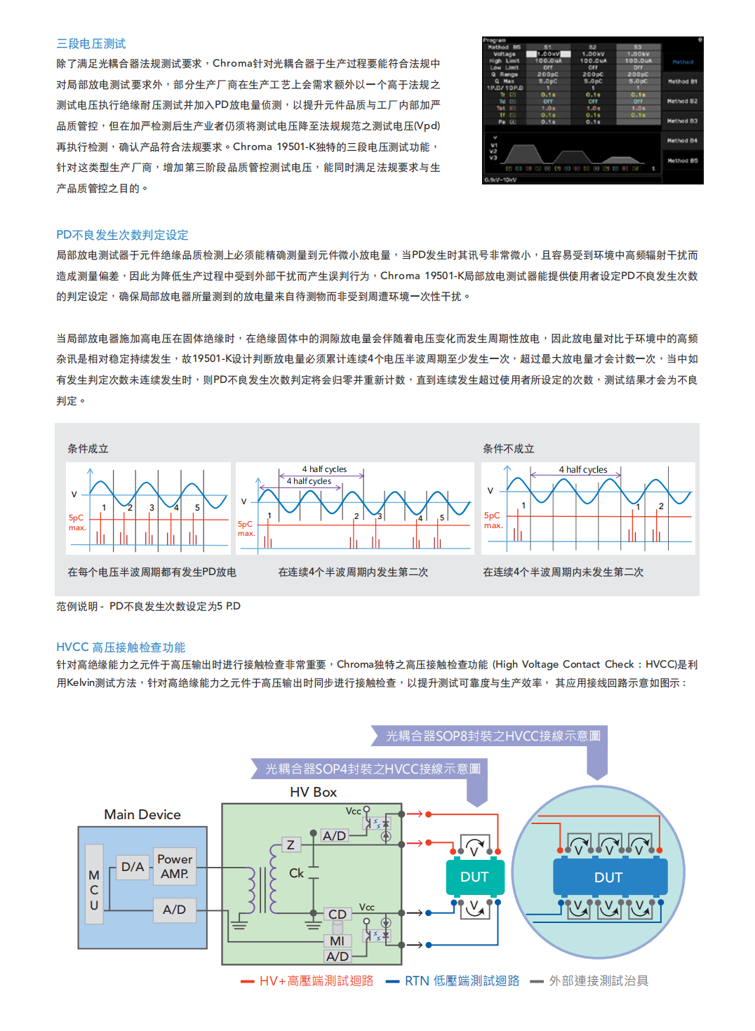 Chroma 19501-K局部放电测试器内建交流耐电压测试(Hipot Test)与局部放电(PartialDischarge,PD)侦测功能于一单机,提供交流电压输出0.1kV~10kV,漏电流测量范围0.01μA~300μA,局部放电侦测范围1pC~2000pC,针对高压半导体元件与高绝缘材料测试应用所设计与开发。