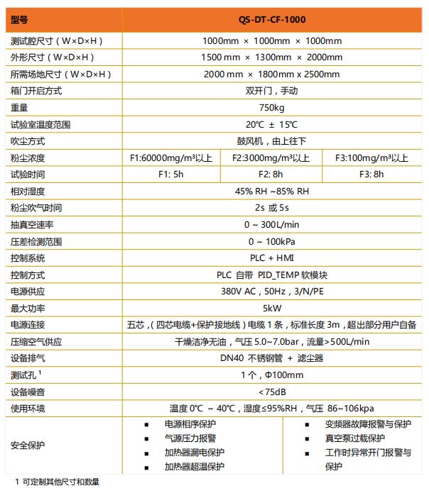 ⚫⚫⚫⚫⚫⚫多重安全保护含菜单界面的试验数据曲线显示⚫以太网接口,可远程监测和控制系统设计与说明l 鼓风机由变频器控制,可通过设置不同的频率实现不同的风速l l 使用振动器将散落在箱壁的粉尘振落至筛网l 设备配置有样品抽负压系统,需使用时在箱内将样品与抽负压接口连接起来即可l 根据试验要求计算好抽气流量后,通过调节流量调节阀达到所需流量l l 试验温度要求为±15℃,试验湿度要求为45% RH~85% RHl 箱内安装有温湿度一体式传感器采集箱内温度和相对湿度系统参数与操作① ② ③ ④ ⑤ ⑥ ⑦ ⑧ <span font-size:14px;color:#000000;"="" style="box-sizing: border-box;color: rgb(0, 0, 0)">保护型运行与停止触摸按键,每个操作均需确认① 试验箱温度设置② 运行模式选择:C1/C2/C3③ 风速设置:最大25m/s④ 测试总时间设置,最大值99999小时⑤ 震动周期和时间设置⑥ 吹尘周期时间设置⑦ 若配有串口通信,可进行通信波特率和节点号设置⑧ 每次参数的修改需保存后方可生效设计与技术参数